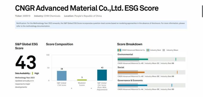 CNGR achieved a score of 38 points in the 2023 S&P Global CSA Score, which is a 10-point increase compared to the previous year. Notably, this score meets the threshold for inclusion in the "S&P Global Sustainability Yearbook (China)," representing a benchmark level of sustainable development for Chinese companies. Simultaneously, CNGR's MSCI ESG Rating has risen from a B grade in 2022 to a BB grade in 2023, positioning it at an intermediate level compared to relevant industry peers. In FTSE Russell's ESG Rating, CNGR achieved an impressive score of 2.6, significantly higher than the industry average.
