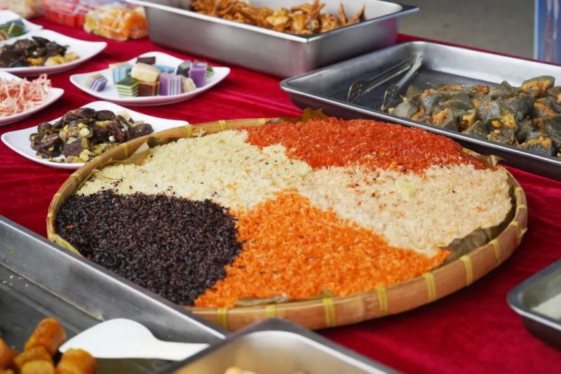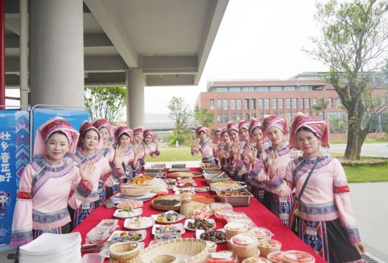 伴随着此起彼伏、高遏行云的歌声,另一边的长桌美食盛宴也拉开帷幕,有象征吉祥如意、五谷丰登的五色糯米饭;有清香四溢、满口香甜的各色水果;有清甜软糯、蕴含着壮族人民对美好生活向往的粽子;还有各式各样、满口留香的面点......食材丰富,色香味俱佳,把壮乡民俗特色展现得淋漓尽致。