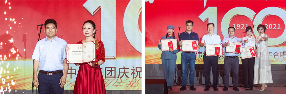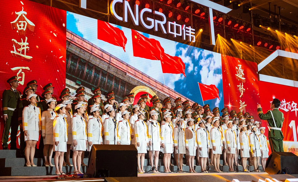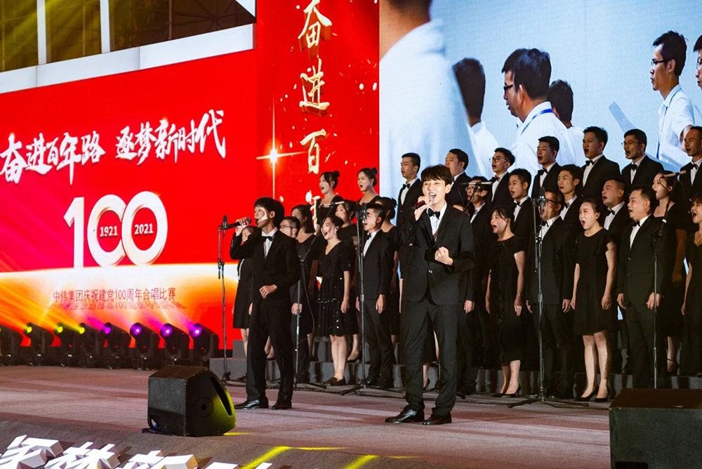 在主持人的宣布下,合唱比赛正式开始。来自各事业部、各产业基地的8支队伍相继登台,他们或穿着光彩照人、颜色各异的演出服,或穿着整齐庄严、意义非凡的红军服,伴随着音乐老师的指挥,用嘹亮、深情的歌声,回顾和纪念中国共产党的百年奋斗史。